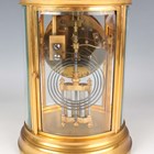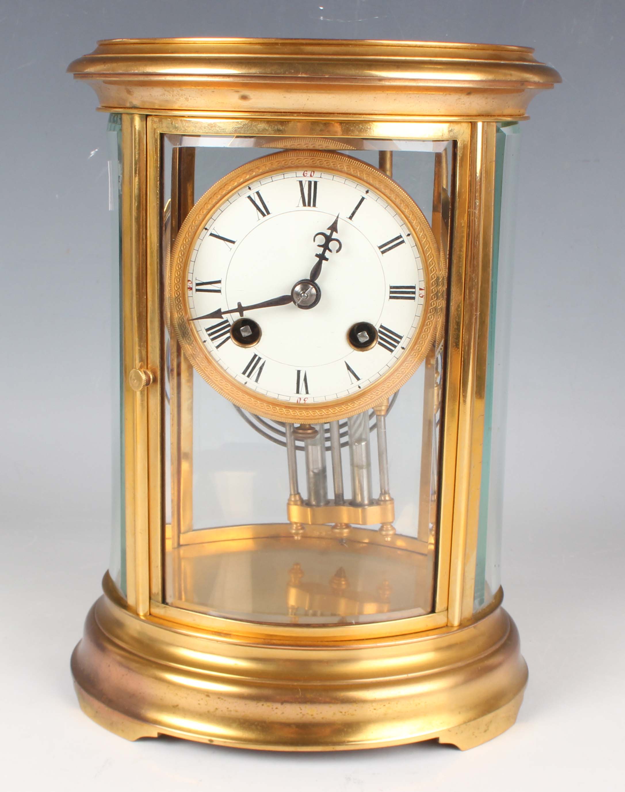 A late 19th/early 20th century French lacquered brass oval four glass cased mantel clock with eight day movement striking on a gong, and mercury compensated pendulum, the white enamelled circular dial with black Roman hour numerals, the oval case with bevelled glass panels, on a moulded base and bracket feet, height 22.5cm.