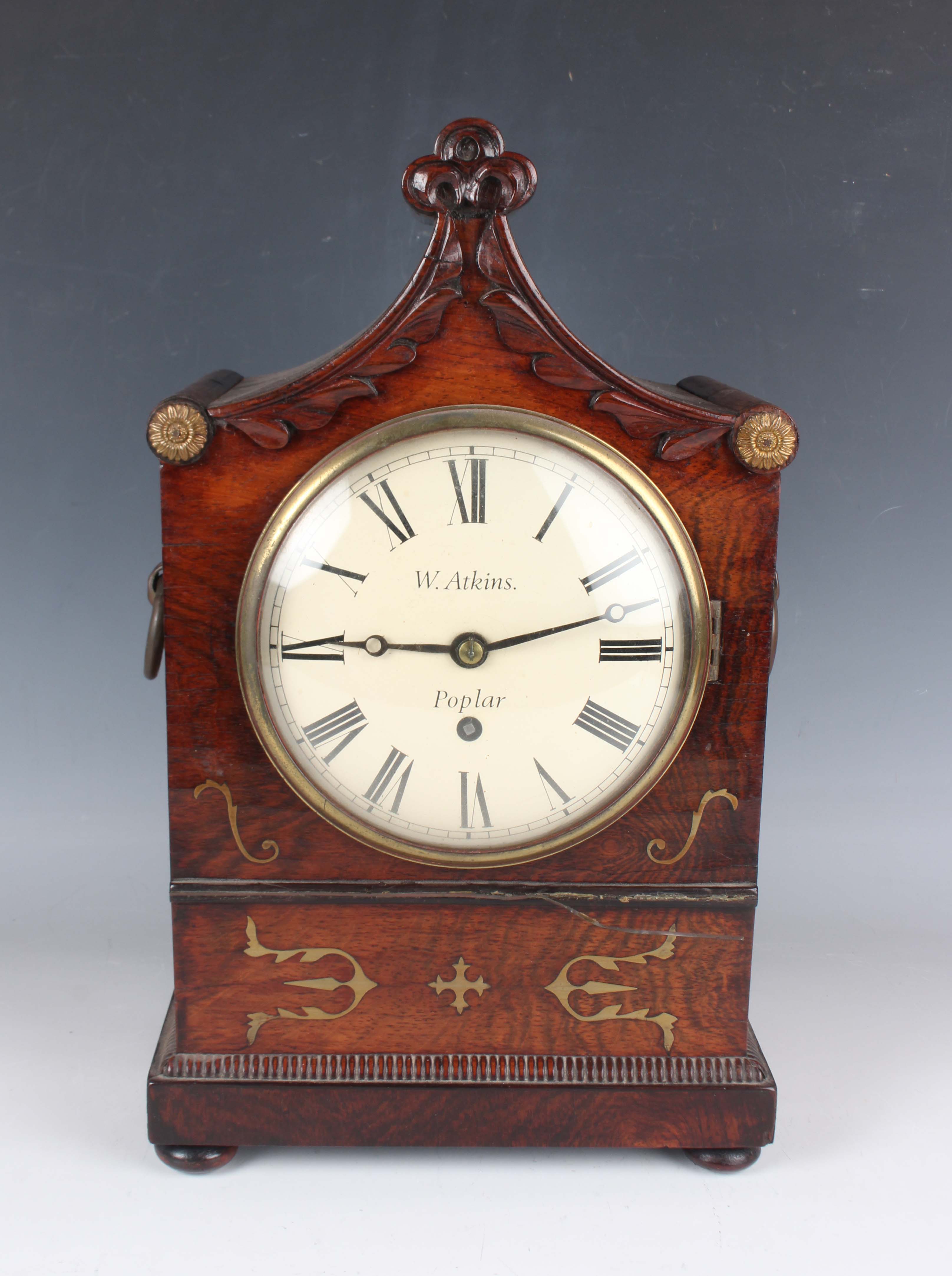 A Regency brass inlaid rosewood mantel timepiece with eight day single fusee movement, the 6-inch painted circular dial with black Roman hour numerals and inscribed 'W. Atkins Poplar', the case with trefoil surmount above applied foliate scroll mouldings, gilt rosettes and a pair of brass loose ring handles, on a rectangular base and bun feet, height 38.7cm, with pendulum. Note: W. Atkins is a recorded London clockmaker working in Poplar in the early 19th century.