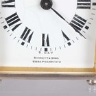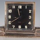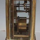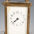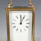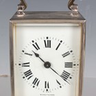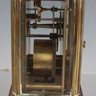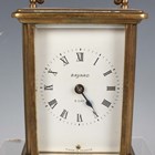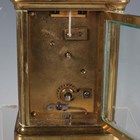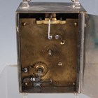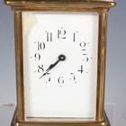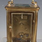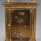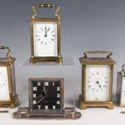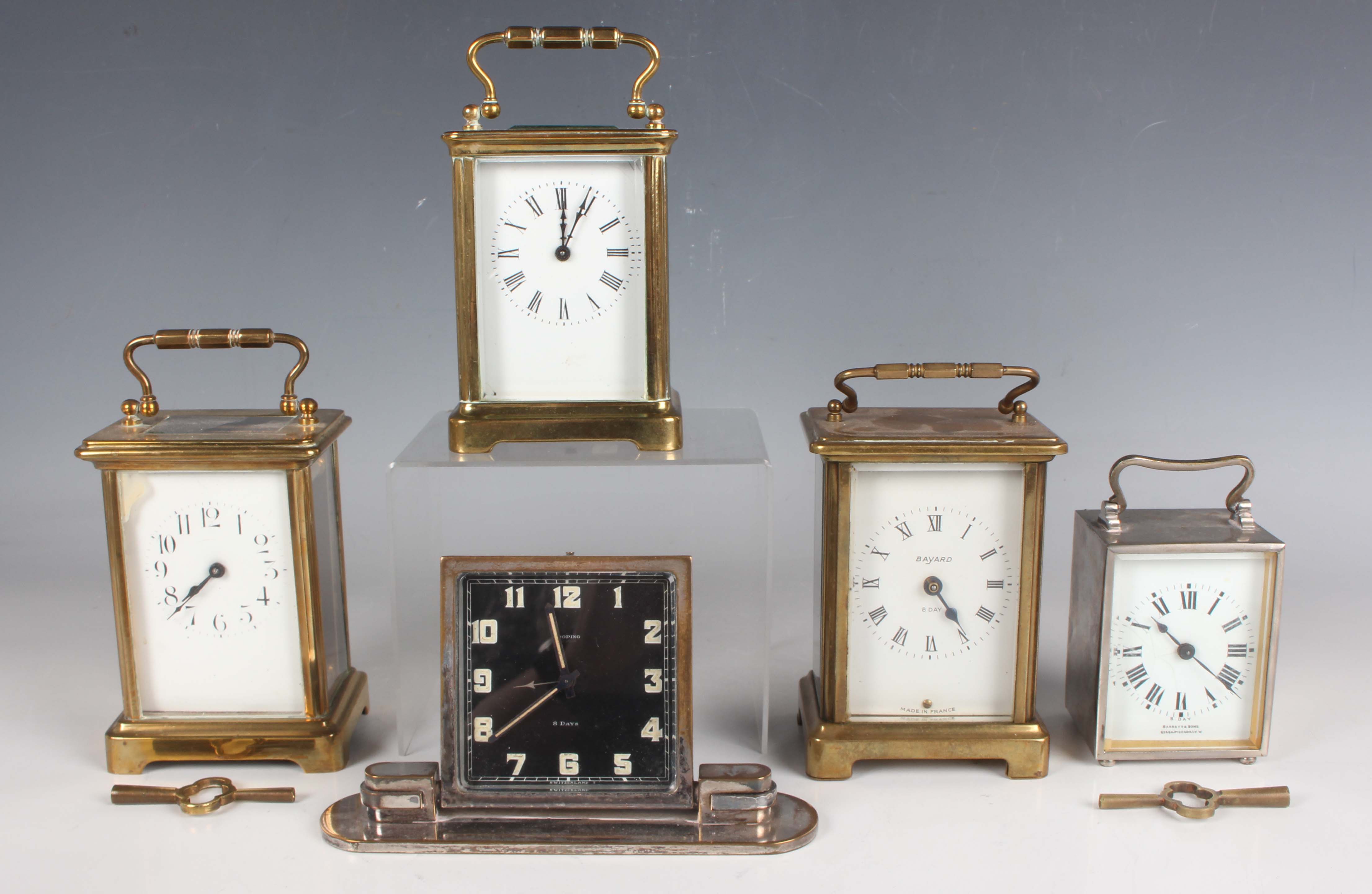 An early 20th century brass corniche cased carriage timepiece, the white enamelled dial with black Roman hour numerals, height 14cm, together with a plated cased carriage timepiece, detailed 'Barrett & Sons 63 & 64 Piccadilly W', height 10.5cm, two other brass cased carriage timepieces and an Art Deco plated brass alarm clock, the square brass dial detailed 'Looping 8 days', height 8.5cm.