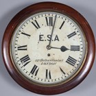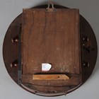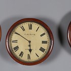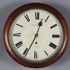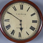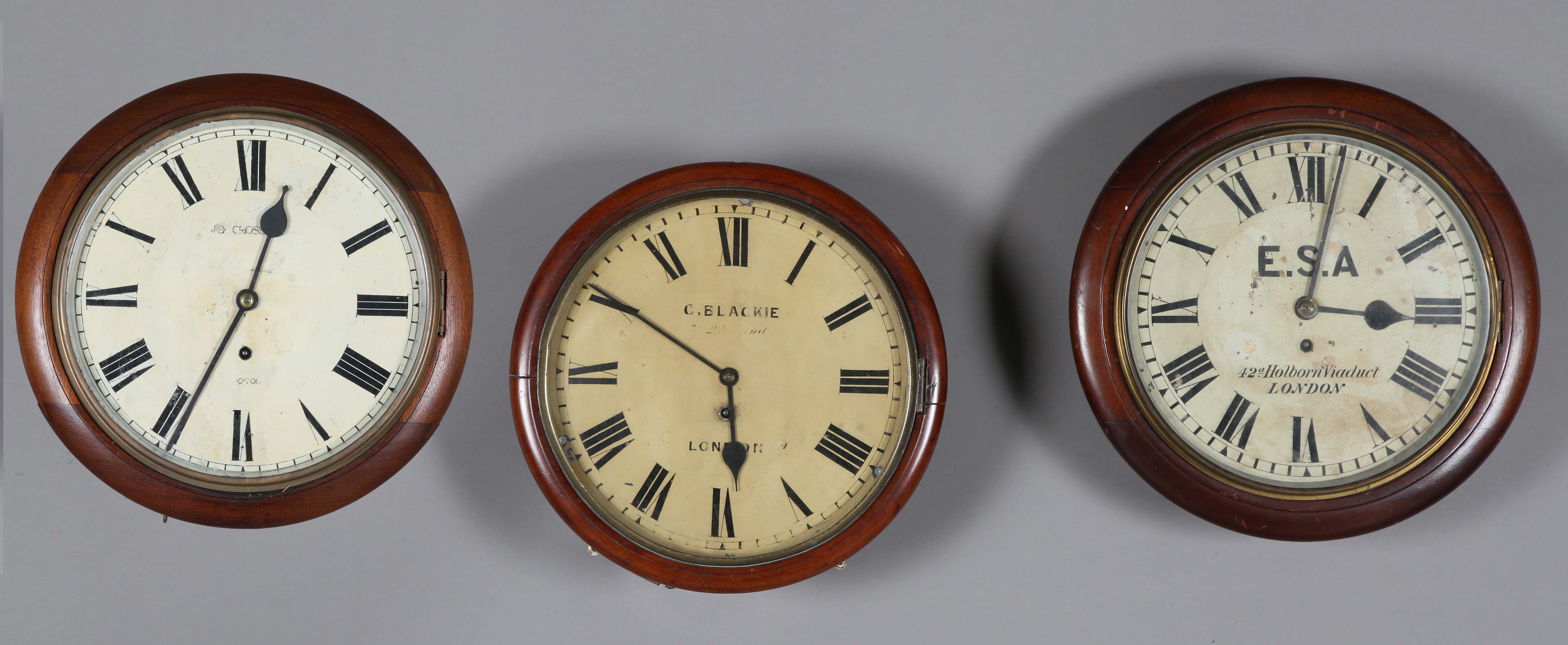 A late 19th century mahogany circular cased wall timepiece with eight day fusee movement, the 12-inch painted circular dial with black Roman hour numerals and detailed 'C. Blackie... Strand London', within a turned surround, case diameter 36cm, together with two other circular wall timepieces, one with fusee movement, case diameters 38cm and 39cm (faults and alterations), one with pendulum.