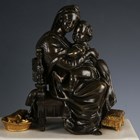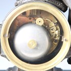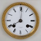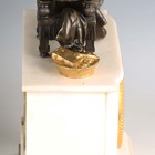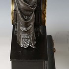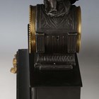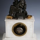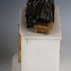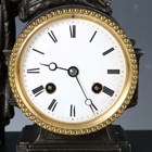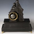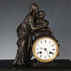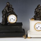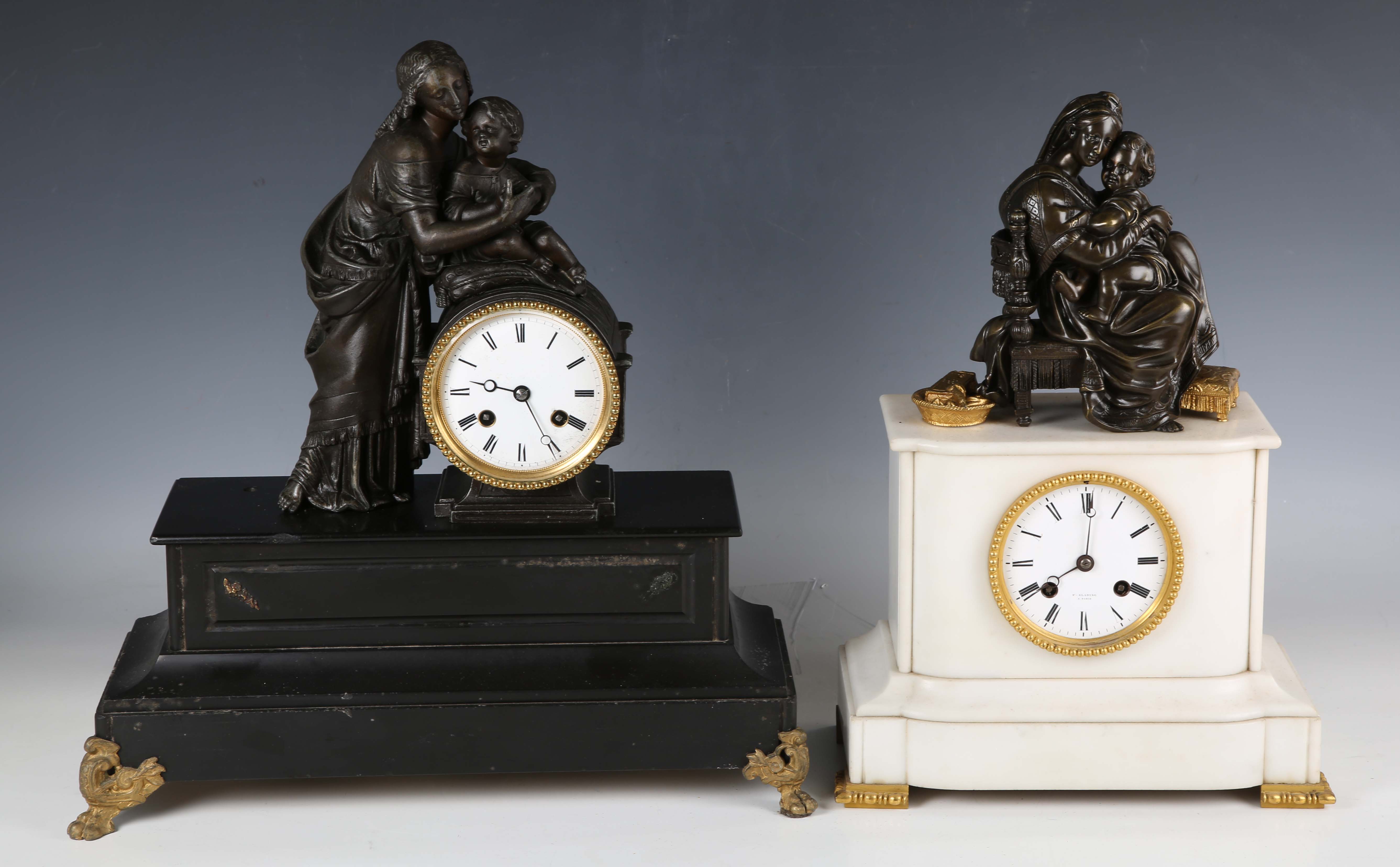 A late 19th century French white marble and bronze mantel clock with eight day movement striking on a bell, the case with mother and child surmount, height 36.5cm, with pendulum, together with a similar slate cased mantel clock, height 39cm, with pendulum.
