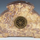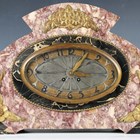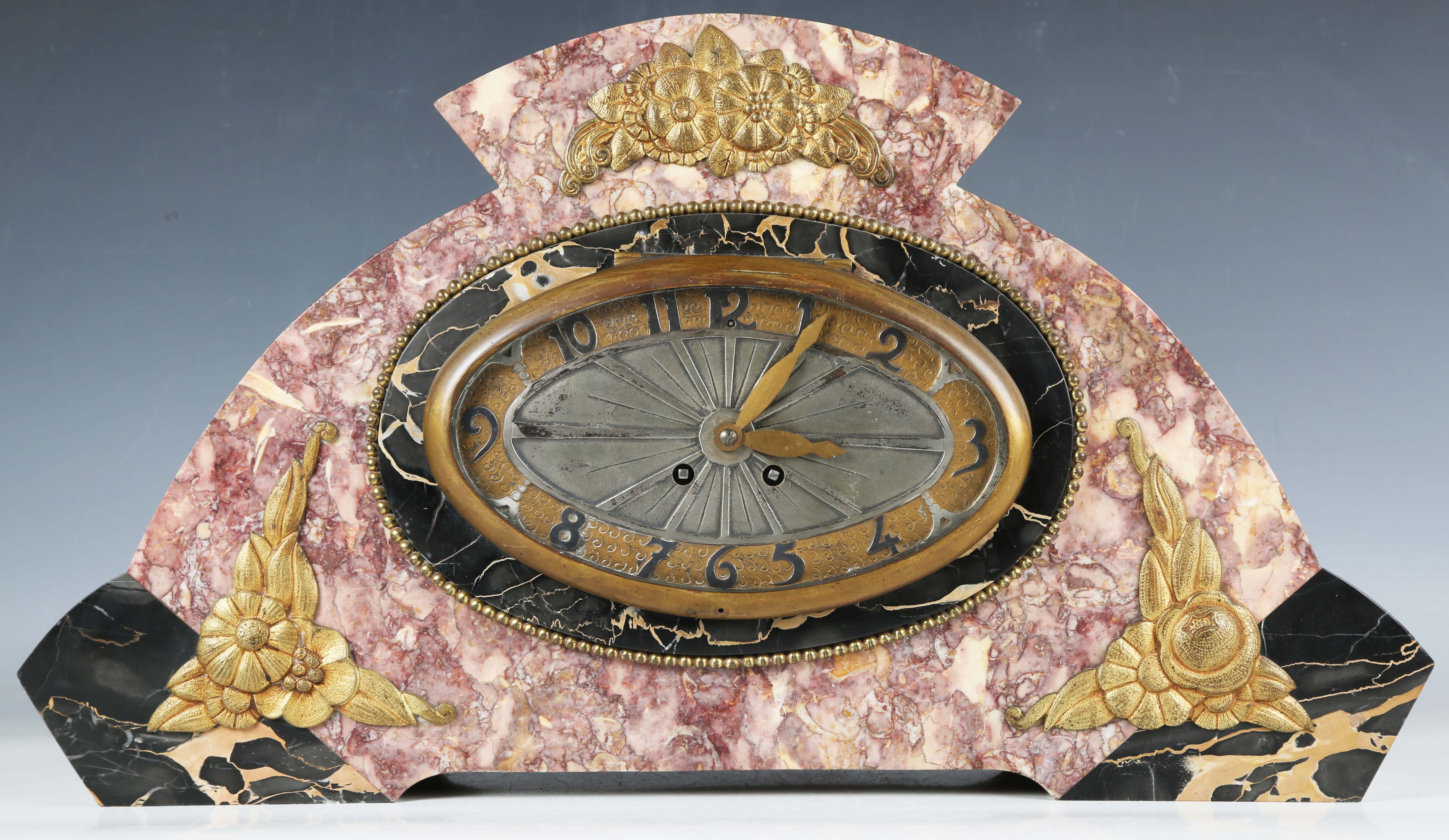 An Art Deco French rouge marble mantel clock with eight day movement striking on a bell via an outside countwheel, the silvered oval dial with Arabic hour numerals, the arched case with applied gilt flower sprays, height 33cm (lacking pendulum).