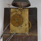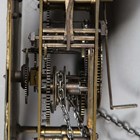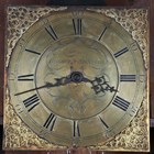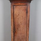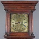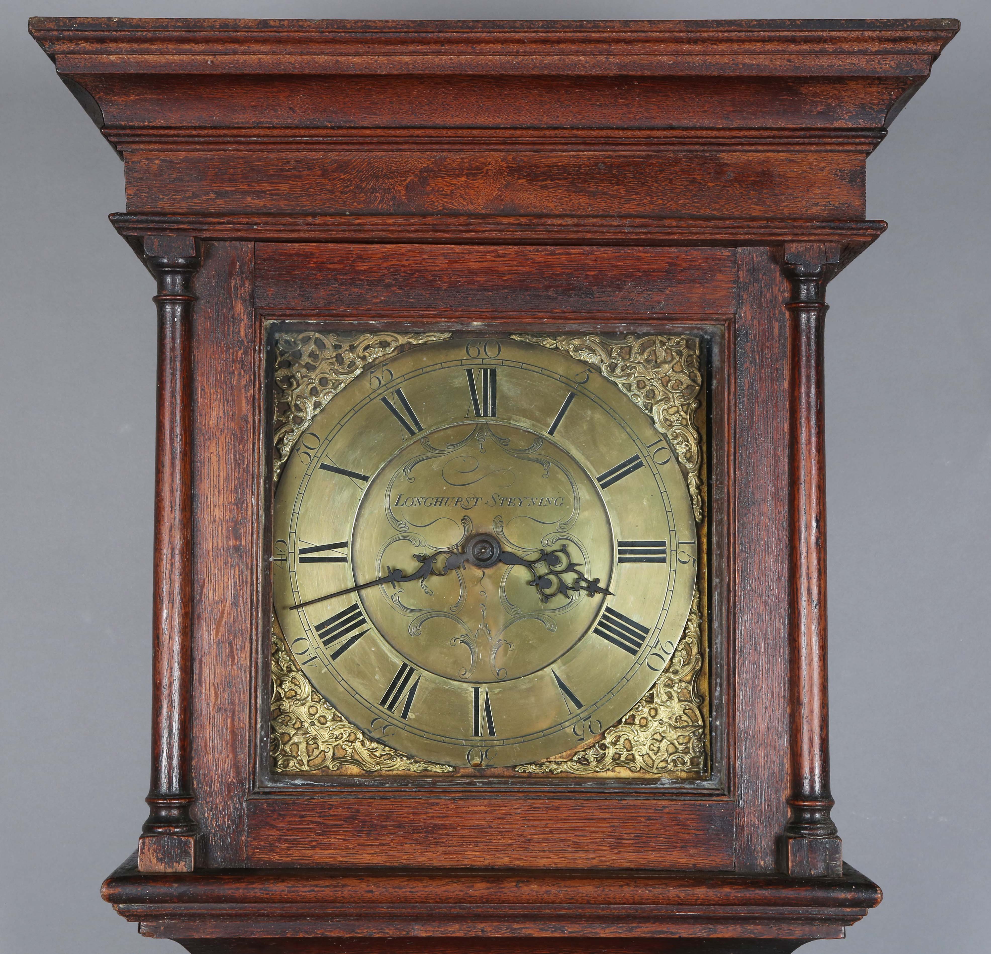 A George III oak longcase clock with thirty hour movement striking on a bell via an outside countwheel, the 10-inch square brass dial with Roman hour numerals and inscribed 'Longhurst, Steyning', the hood with a moulded pediment above a glazed door flanked by columns, the trunk with a plain door above a plinth base, height 198cm, with pendulum and a weight.