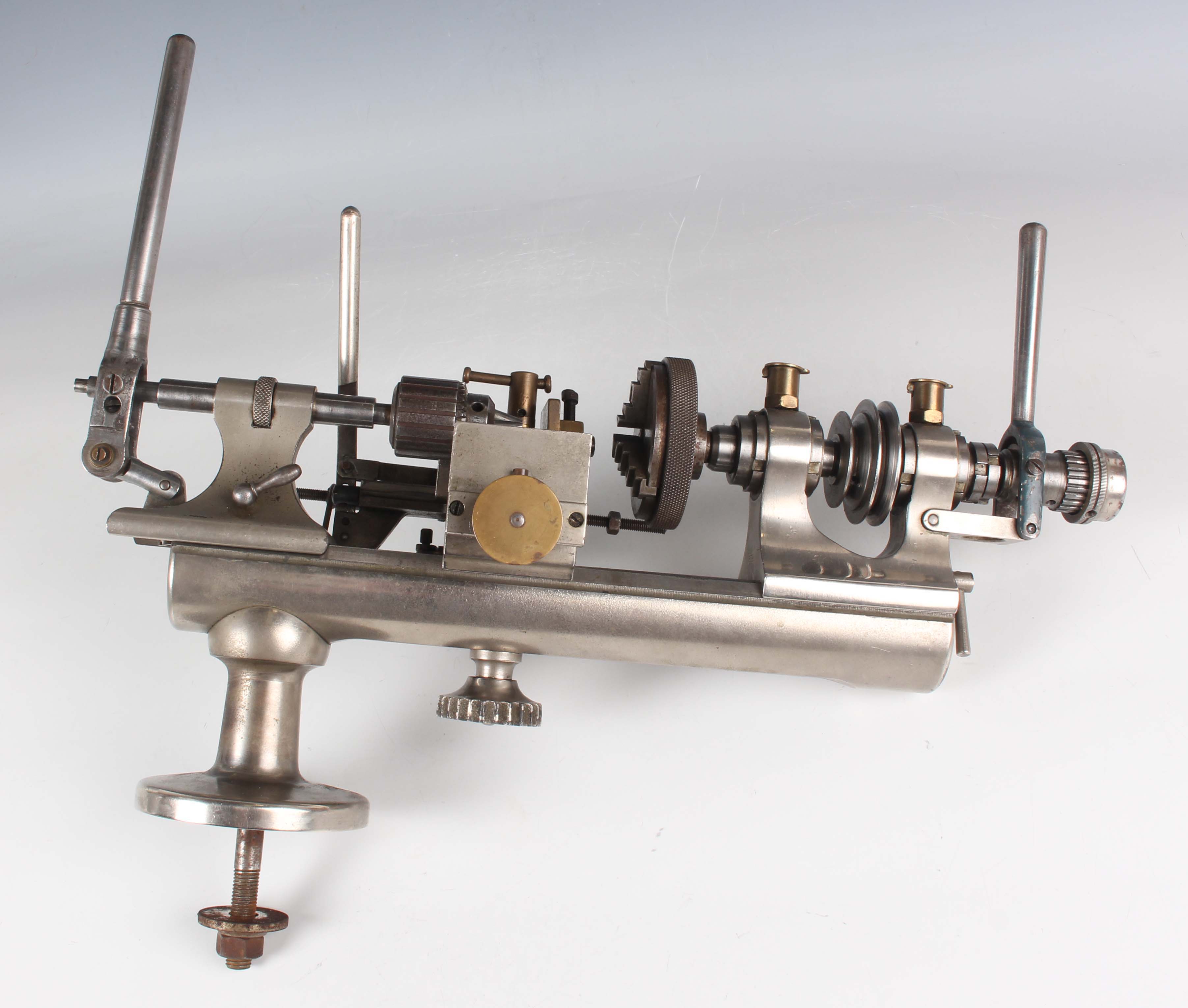 A Pultra of Manchester 8mm watchmaker's lathe with slide rest and various accessories.