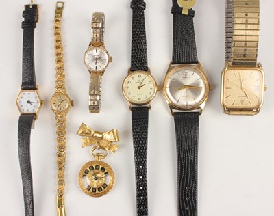 A blued steel and gold cased keyless wind open-faced quarter repeating gentleman's pocket watch, the unsigned jewelled movement repeating on a coil, with gunmetal inner case, the enamelled dial with Arabic hour numerals and subsidiary seconds, case diameter 5cm (winding button lacking), together with a keyless wind open-faced lady's fob watch, detailed '0,800', a keywind open-faced lady's fob watch, detailed '0,935', on a leather strap, with key, and a gunmetal cased keyless wind open-faced lady's fob watch.